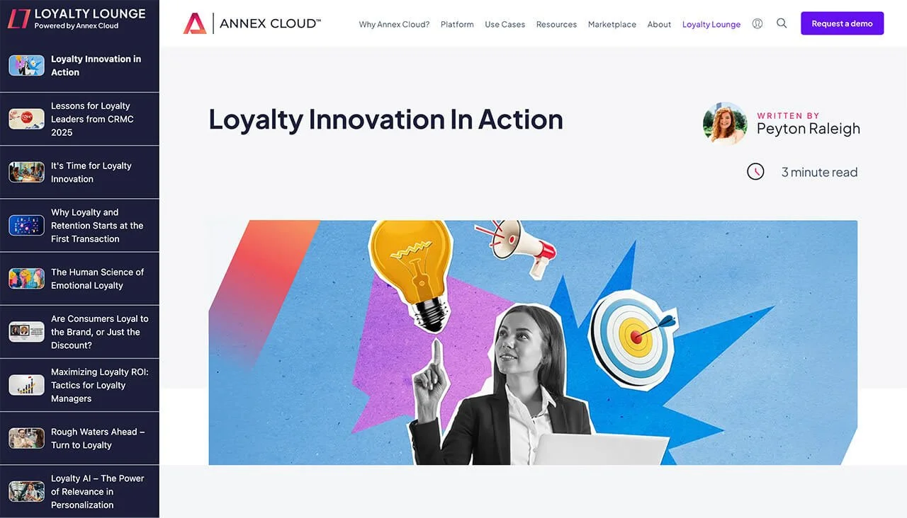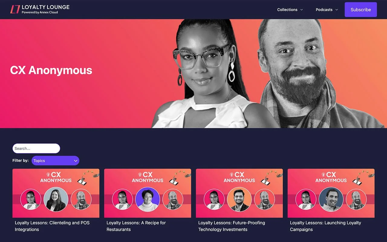 The Loyalty Lounge by Annex Cloud is a dedicated digital hub for loyalty professionals, offering a "Netflix‑style" experience with expert-led content to inform, inspire, and empower a company’s loyalty strategy. The Loyalty Lounge contains a range of formats, from blog posts and infographics, to webinars and podcasts.